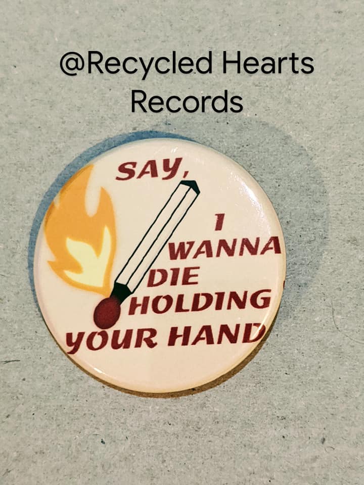 Our buttons are 1.75in which makes them a unique size that is both larger enough to make a statement and small enough to fit everywhere! All buttons are hand-pressed, metal-backing, and utilizes supplies that are “Made in the USA.” This makes them a high quality that can last daily wear and tear for years to come. Designs are property of Recycled Hearts Records.