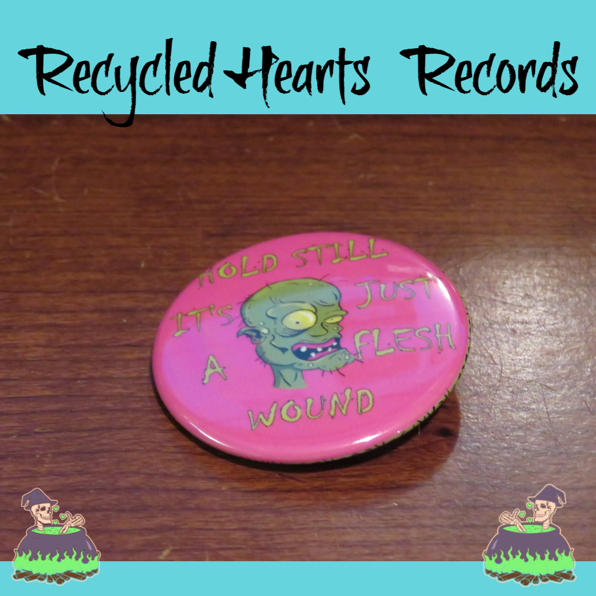 Our buttons are 1.75in which makes them a unique size that is both larger enough to make a statement and small enough to fit everywhere! All buttons are hand-pressed, metal-backing, and utilizes supplies that are “Made in the USA.” This makes them a high quality that can last daily wear and tear for years to come. Designs are property of Recycled Hearts Records.