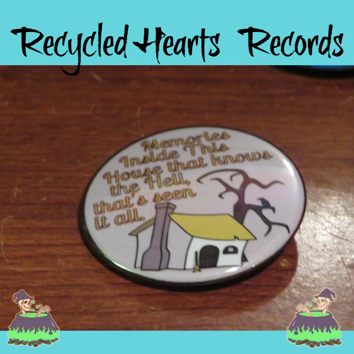 This a button inspired by the artist "Houseworth." Recycled Hearts Records had the pleasure of releasing their album "Sleeping with Ghosts Again" in 2019. The button has lyrics from a song on it, and a part of the proceeds of purchasing such button will be given back to the artist. Thank you!
