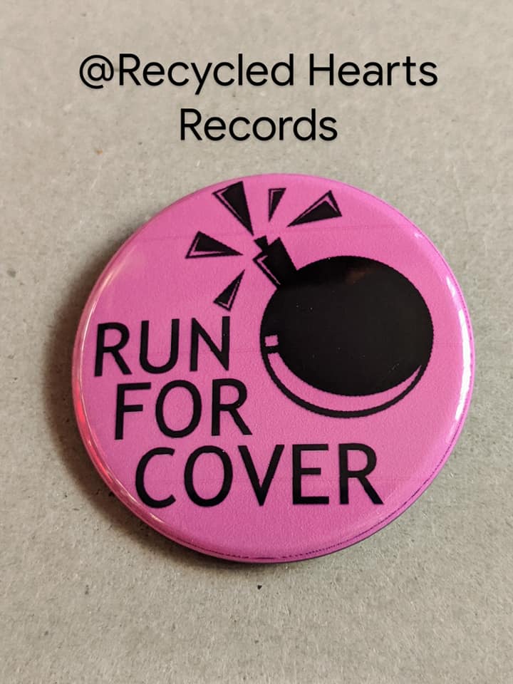 A pink button that says Run for Cover, and has a bomb. Emo, goth, and punk is a broad category.
