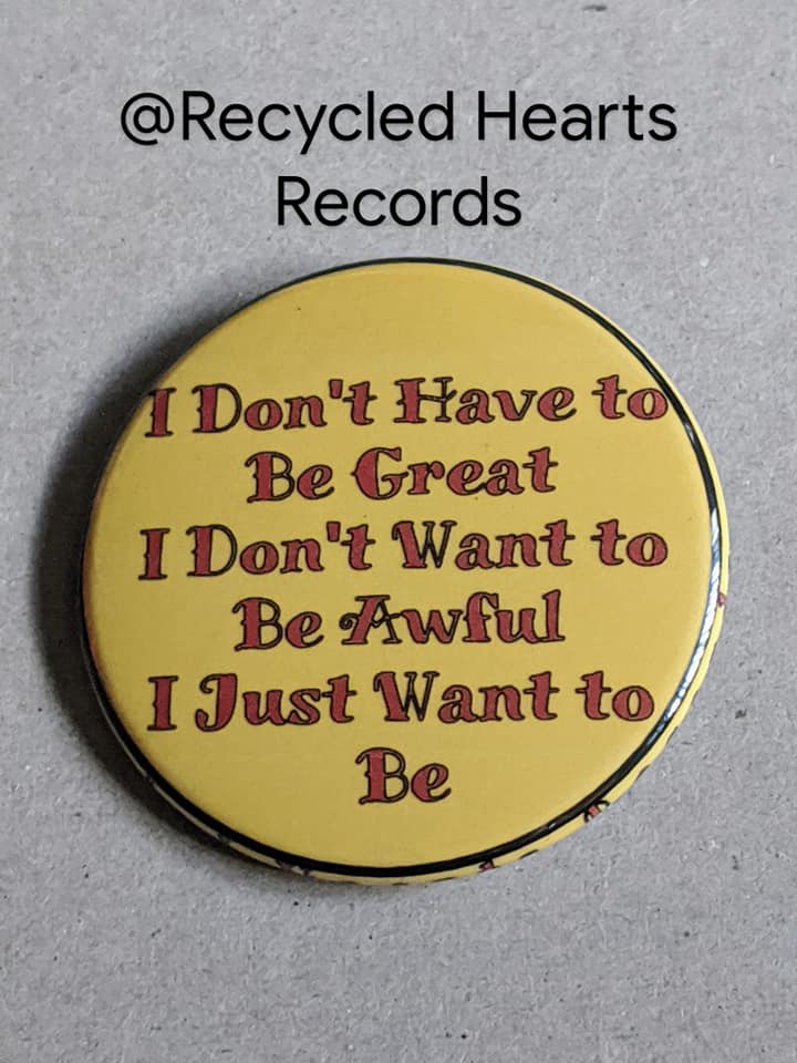 Our buttons are 1.75in which makes them a unique size that is both larger enough to make a statement and small enough to fit everywhere! All buttons are hand-pressed, metal-backing, and utilizes supplies that are “Made in the USA.” This makes them a high quality that can last daily wear and tear for years to come. Designs are property of Recycled Hearts Records.