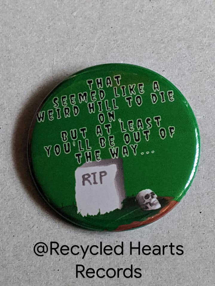 Our buttons are 1.75in which makes them a unique size that is both larger enough to make a statement and small enough to fit everywhere! All buttons are hand-pressed, metal-backing, and utilizes supplies that are “Made in the USA.” This makes them a high quality that can last daily wear and tear for years to come. Designs are property of Recycled Hearts Records.